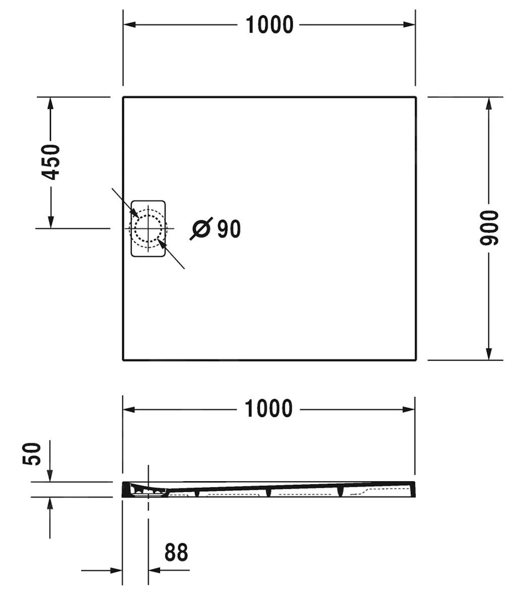 - afvoer: Ø 90 mm, vierkante afvoerkap
