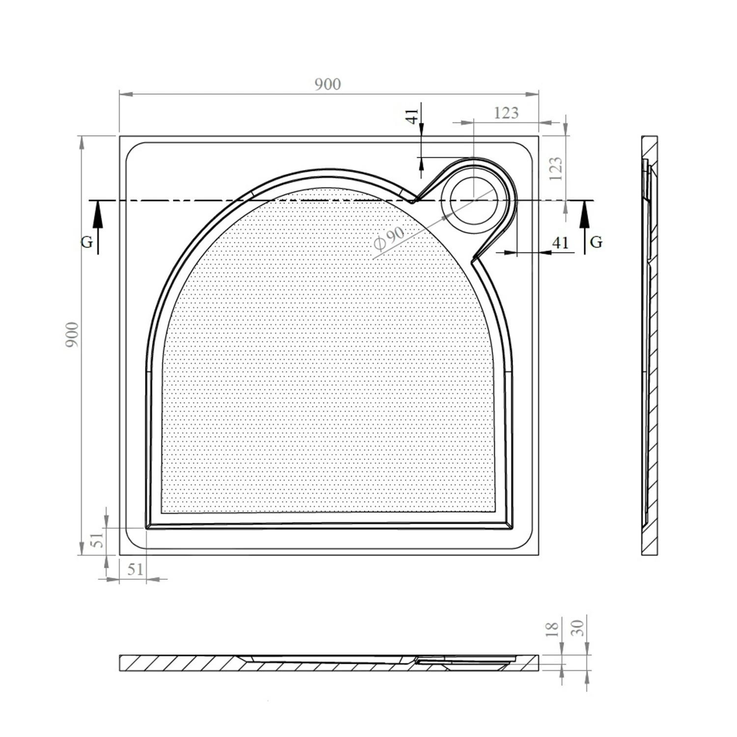 - diepte van de binnenkant van de douchebak 18 mm