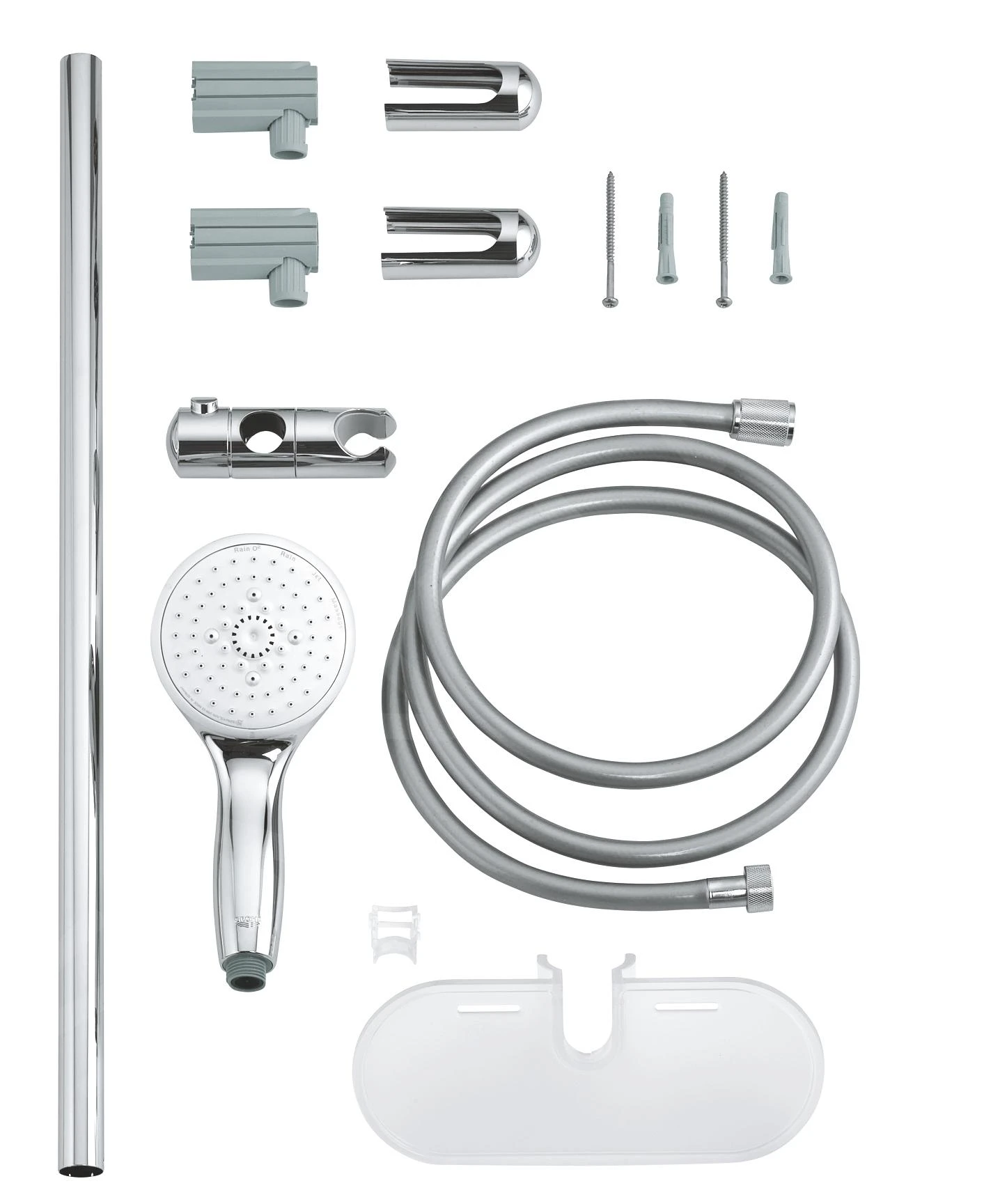 Deze doucheset uit de GROHE New Tempesta 100 lijn maakt van uw badkamer een wellnesscentrum. Hij biedt vier straalsoorten die aan uw stemming aangepast kunnen worden: Rain, waardoor u zich ondergedompeld waant in een warme zomerregen, de prettige Massage, de luxueuze, brede GROHE Rain O2 en de krachtige, revitaliserende Jet. Bij alle straalsoorten zorgt de GROHE DreamSpray technologie voor een geheel uitgebalanceerde waterstraal uit alle sproeigaatjes. Onderdeel van de set is een douchestang, een slang en een handdouche met GROHE StarLight afwerking, waardoor de set uitzonderlijk goed onderhouden kan worden en het middelpunt van elke badkamer wordt. Door de SpeedClean technologie behoort kalkaanslag tot het verleden. De GROHE EasyReach douche tray die deel van de set uitmaakt, is een praktische oplossing voor het opbergen van douchegel en shampoo.