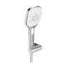 De platte en moderne douche met afgeronde hoeken en witte straalschijf combineert goed met elke kraan en past bij elk tegeldessin. De ergonomisch gevormde handgreep glijdt als vanzelf in de hand en de Select knop kan met één vinger worden bediend.
