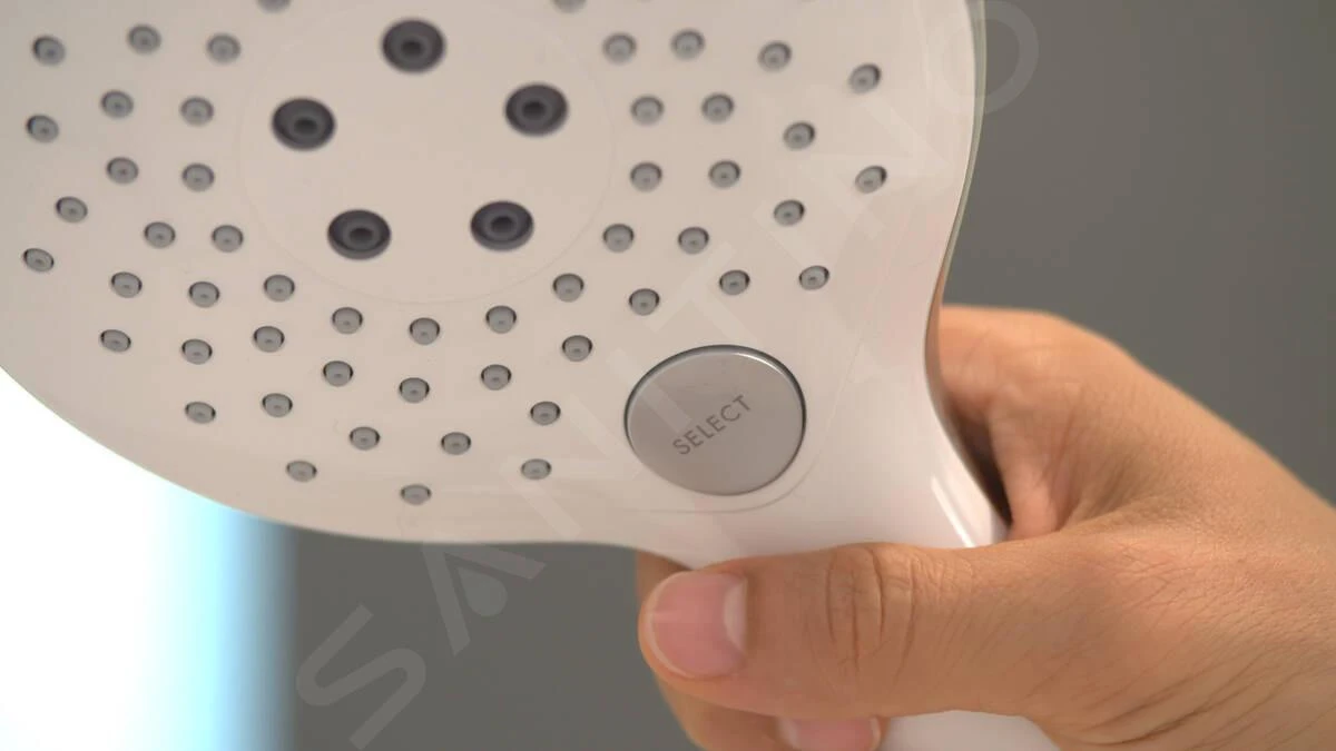 De moderne platte handdouche met afgeronde hoeken en een witte straalschijf vormt een fris contrast met de verchroomde oppervlakken. De ergonomisch gevormde handgreep glijdt als vanzelf in de hand en de Select knop kunt u met één vinger bedienen.